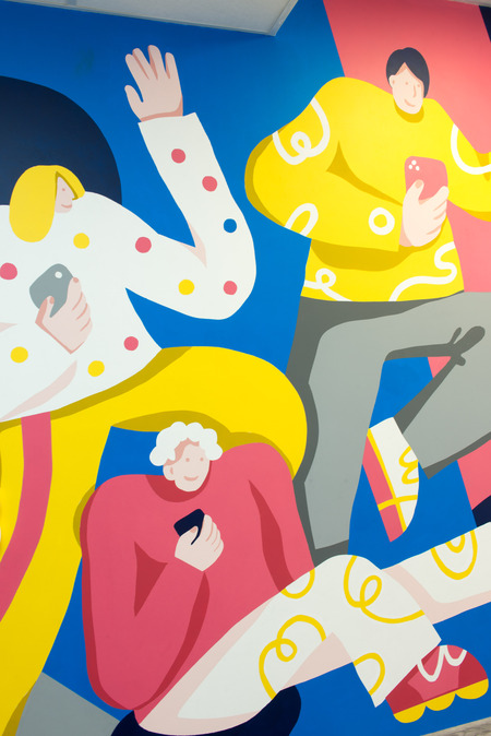 В ходе обсуждения проекта возникла идея о росписи стен иллюстрациями, чтобы сделать пространство центра более интересным, уютным и приятным для посещения. Заказчик хотел увидеть что-то яркое и привлекающее внимание, что порадовало бы студентов, посещающих центр. По присланным референсам были нарисованы три яркие бессюжетные иллюстрации с персонажами, глядящими в экраны телефонов. Палитра была подобрана на базе цветового решения интерьеров. В итоге получились большие и яркие муралы.