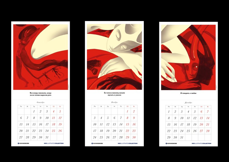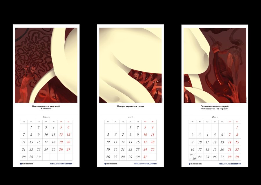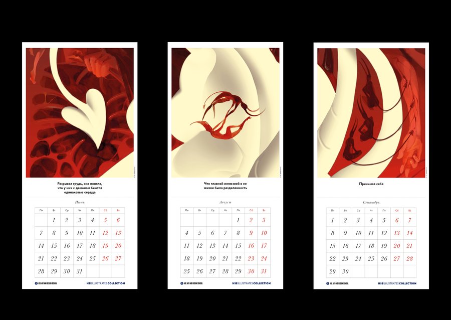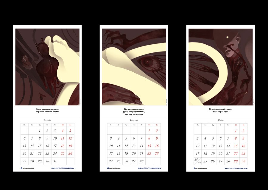 Календарь на тему внутренней борьбы, которая вытекает в борьбу с окружающим миром. Девушка боится демонов и готова биться с ними насмерть. Но узнает, что тоже им является и принимает себя.