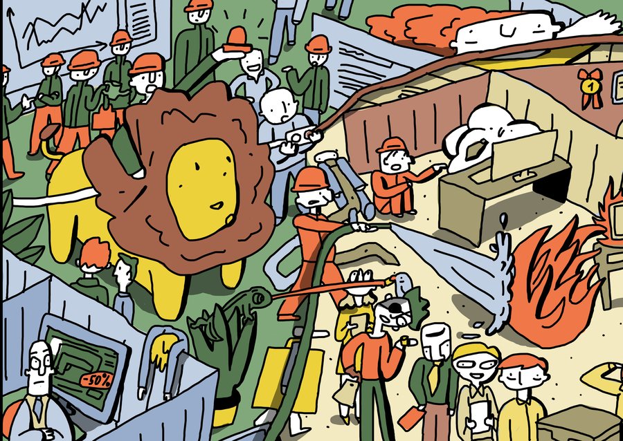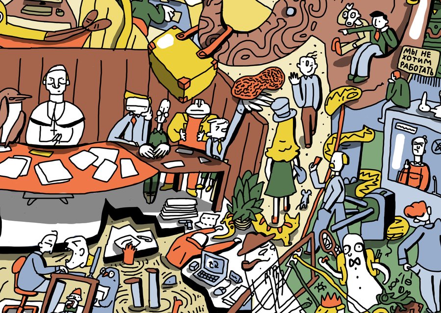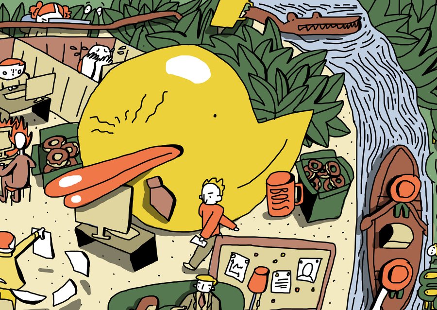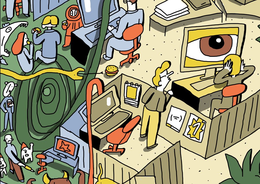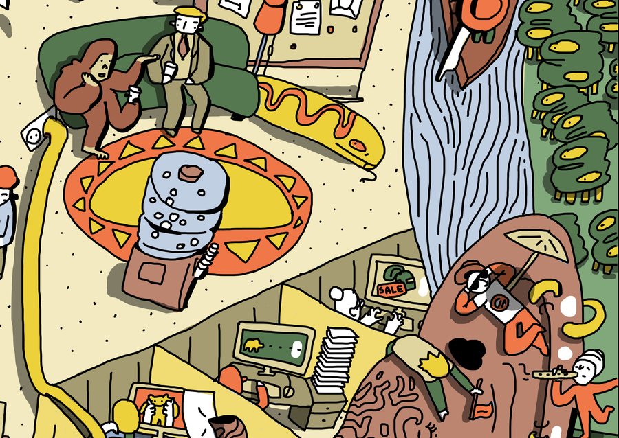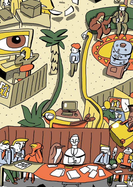 Широкоформатная квадратная иллюстрация о буднях офисных сотрудников. Рабочее пространство вперемешку с джунглями складывается в лицо Майкла Скотта.