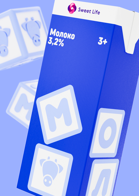 Sweet life — это собственная торговая марка сети супермаркетов Smart. Задача брифа состояла в том, чтобы разработать дизайн упаковки для детской молочной линейки, которая бы отражала характер и ценности бренда Sweet life и была бы привлекательной для мам и детей в супермаркетах. В моей концепции серии упаковок проиллюстрировано произношение продуктов по буквам в детских кубиках. Таким образом, дети с удовольствием кушают вкусную молочную продукцию и одновременно с этим учатся говорить, разбивая слова на буквы.