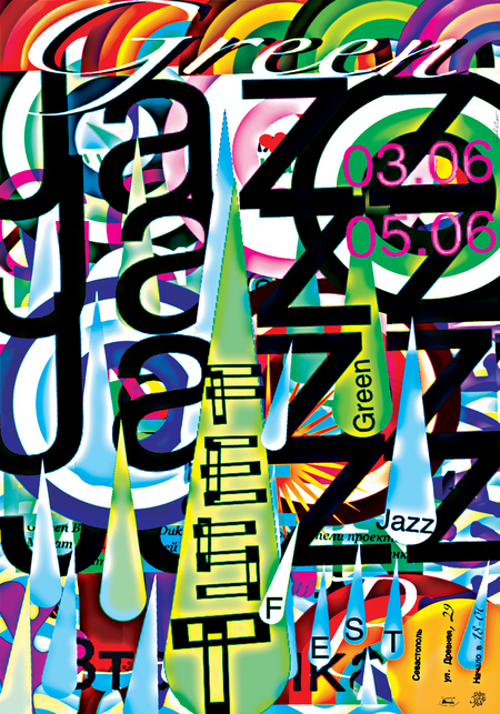 Афиша джазового фестиваля Green Jazz Fest. Фестиваль проходит ежегодно в начале июня в Севастополе, на площадке галереи современного искусства «Зеленая пирамида» в музее-заповеднике Херсонес Таврический. Плакат был сделан в импровизационном режиме в игровом графическом приложении.