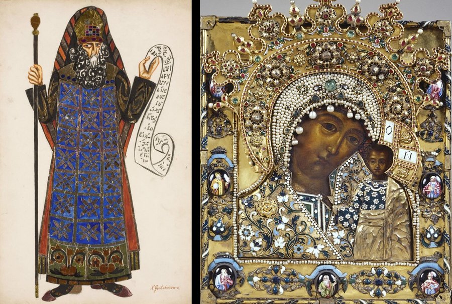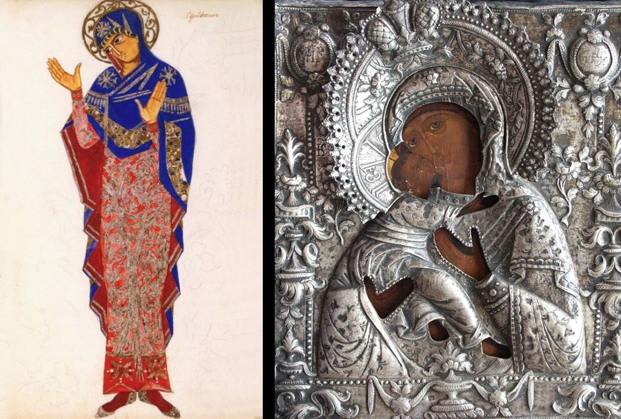 Н. Гончарова. Эскизы костюмов израильского священника и Богоматери к балету «Литургия» | Казанская икона Богоматери, автор неизвестен, 18 в. | Богоматерь Владимирская, автор неизвестен, 17 в.