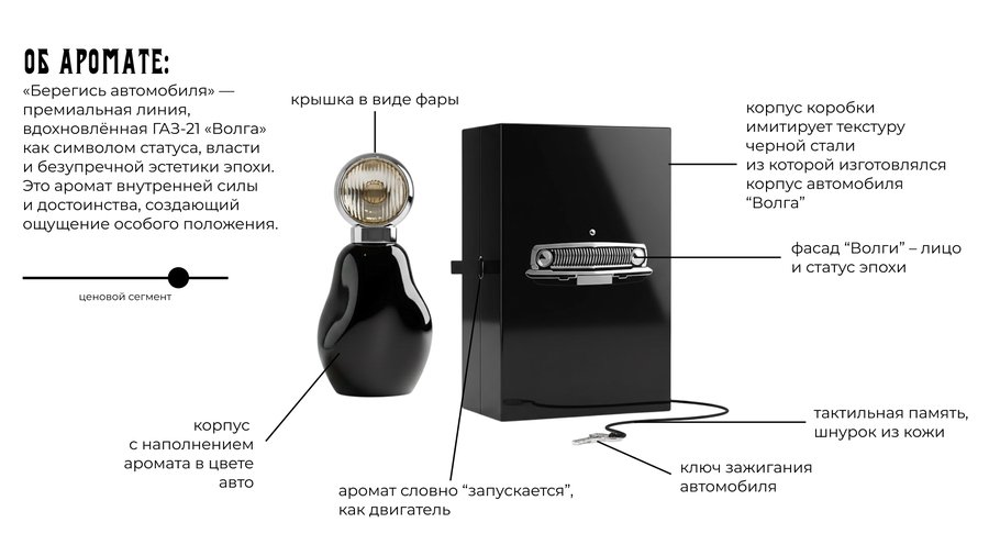 «Берегись автомобиля» — концептуальный нишевый парфюмерный бренд, переосмысляющий советский автомобиль не как объект техники, а как носитель социального, визуального и эмоционального кода эпохи.