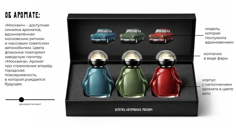 Колпачок в форме фары объединяет коллекцию. Она есть у любого автомобиля, независимо от класса и статуса. Это источник света, движения и ориентира: визуальная метафора аромата, который ведёт, проявляет и оставляет след. Коллекция строится на контрасте закрытой роскоши ГАЗ-21 «Волга» и живой городской повседневности Москвича.