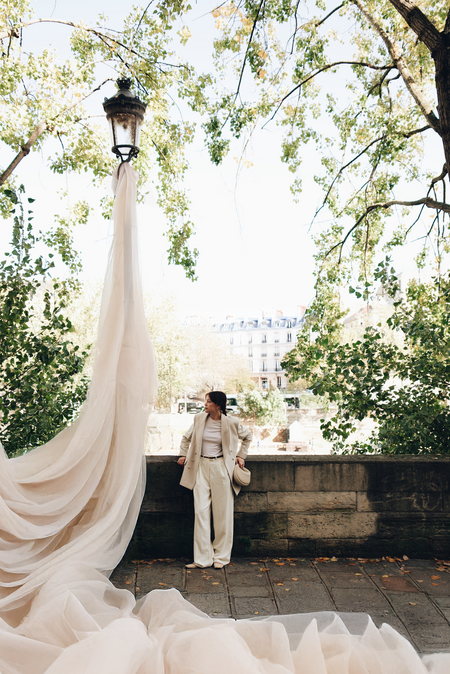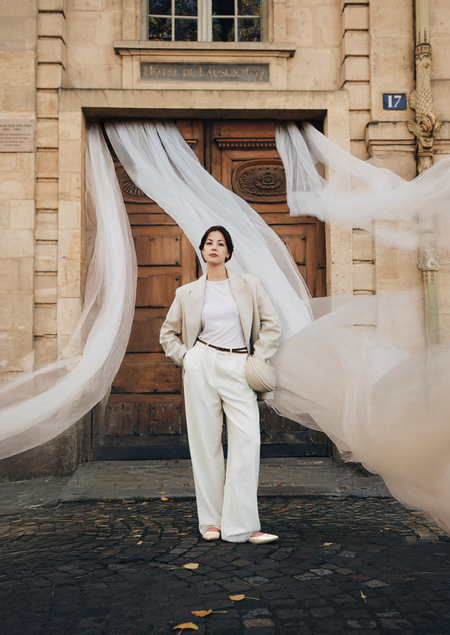 но одновременно изменяя её своим присутствием. Белая ткань, как символ невесомости и чистоты, струится за ней, взаимодействуя с архитектурой не как с фоном, а как с живым свидетелем перемен