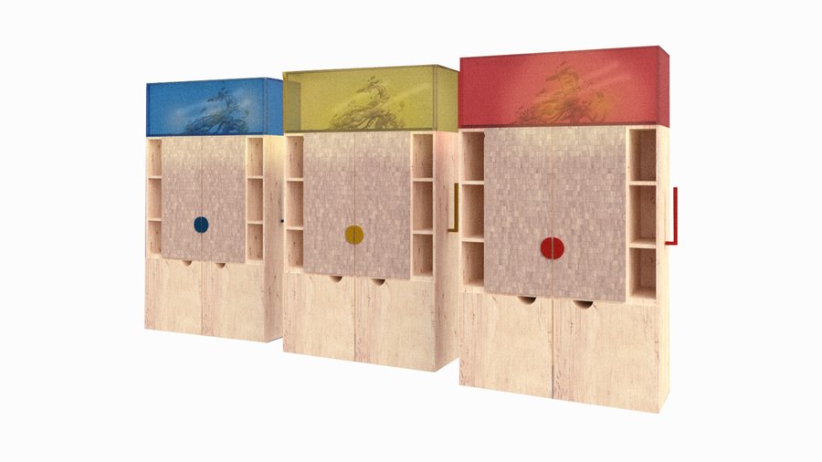 Верх шкафа — стеклянная поверхность глубокого синего тона, создающая эффект холодного света, работающая на контрасте с теплыми оттенками дерева. Внутри стекла заключена старая хрустальная люстра — она играет роль своеобразного сердца объекта, символизирующего соединение традиции и современности. Хрусталь преломляет свет, отбрасывая сияние на деревянный поверхности и создает атмосферу сакрального пространства, что особенно близко культуре татуировки, где каждый штрих — это ритуал.