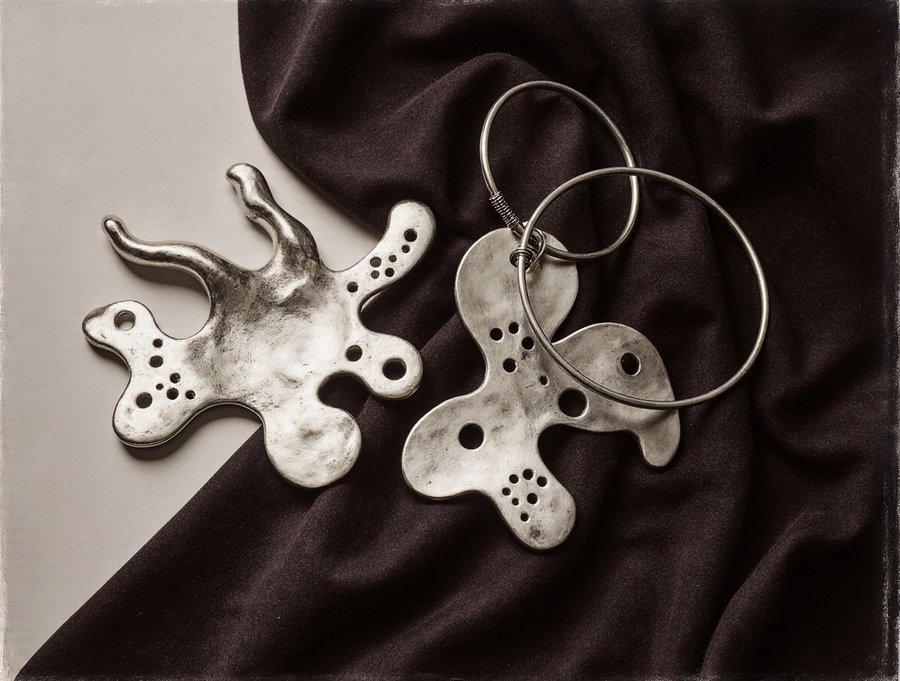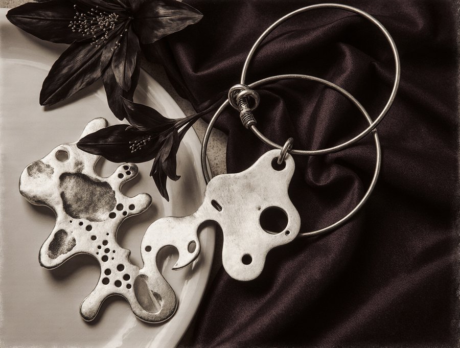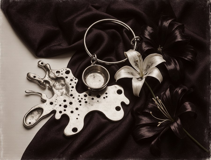 Create an image featuring a metal charm placed on an interesting rounded dish. Beside the dish, there are scattered black lilies laid out on the table, their dramatic shapes and dark petals enhancing the mysterious and artistic atmosphere. The composition focuses on the glint of metal and the organic flow of the flowers, highlighting contrast and elegance. Use style hard flash