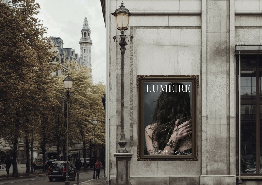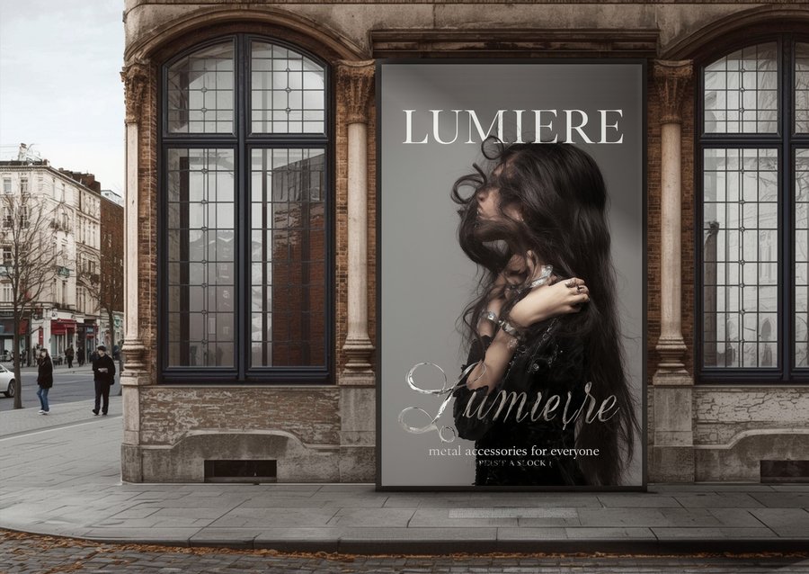 Make poster for for a metal jewelry brand. There are should be the biggest text «Lumiere» like a name of brand and «Metal accessoories» like a annotation of brand, also there should be texted «Sculpting Light in Metal». Use a cursive English font with decorative swirls. Use pinned image for color and shape of jewerly reference. On backgroud put some balck and white lillies. It should be bold and elegant at the same time.