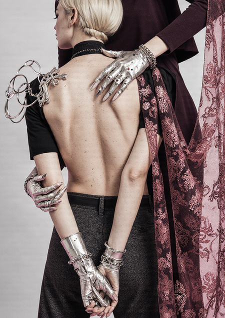 Create an image of a couple holding hands, focusing on the middle part of their bodies from torso to hips. On the woman’s hand is a metal glove. Their faces are not visible. A metal charm hangs from their clothes. The atmosphere should be intimate, tender, and emotional.