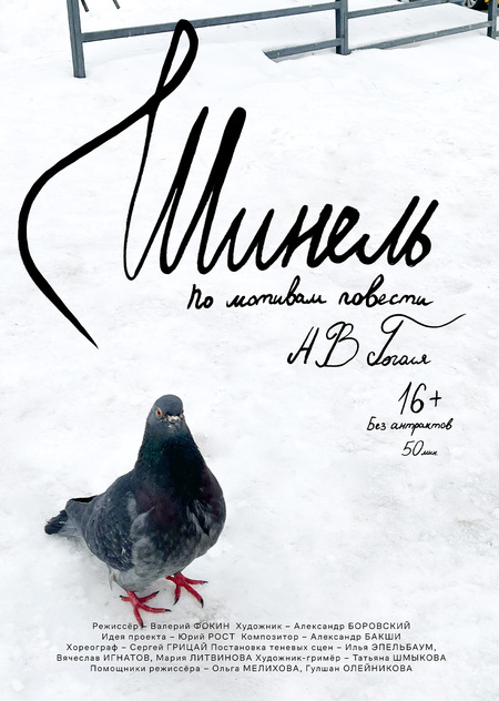 В серии из 3 плакатов к постановке «Шинель» приводится параллель между Акакием Акакиевичем и городскими птицами. Главный герой, как и серая городская птица, сливается с сотнями таких же и проходит мимо нас незамеченным. Он ведет свою маленькую жизненную рутину и боится кошек, которые могут разодрать оперение.