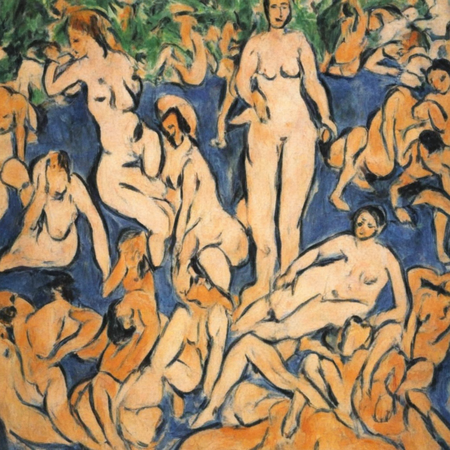 Мне кажется, модели удалось передать атмосферу, близкую к стилю Анри Матисса. Однако тела часто сгенерированы с искажениями, а цвета получаются более приглушёнными, в то время как у Матисса они яркие и выразительные.