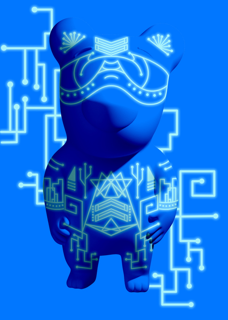 Фигурка выполнена в фирменном цвете VK, который служит фоном для ярких неоновых элементов. Поверхность скина будет украшена абстрактными геометрическими узорами, напоминающими микросхемы. Основные акценты могут выполнены неоновой краской, которая будет светиться в темноте. Такое решение создаст эффект технологической энергии и динамики.