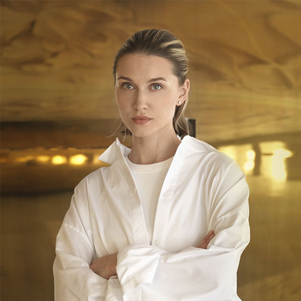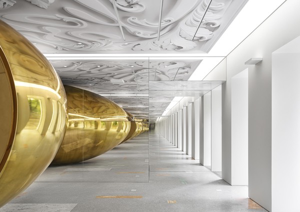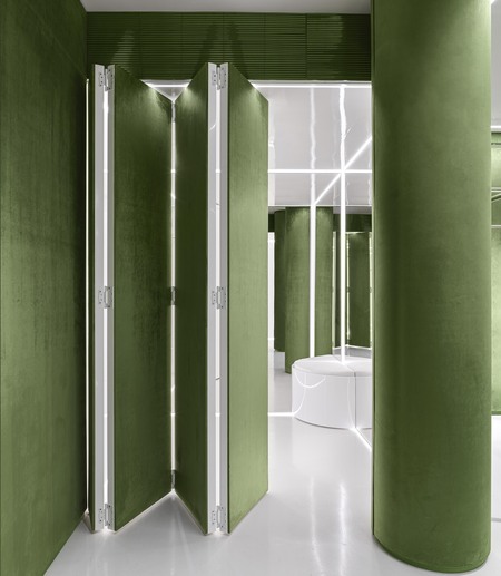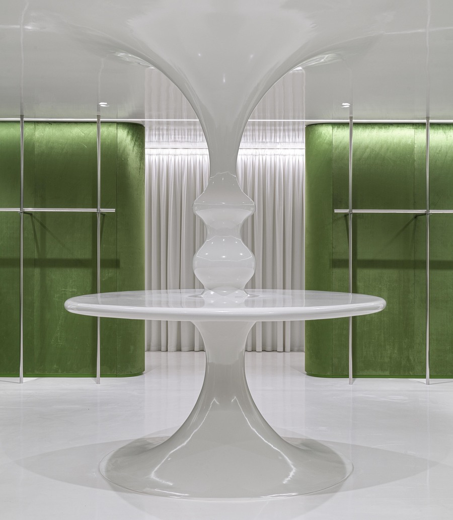 Stepping off the ladder and walking along the partition with niches, the customer ends up in the underground hall. Walls are covered with emerald velvet panels. There is a giant white «drop» stretching between the floor and the ceiling. It seems like it symbolically nourishes the golden seed from the upper floor.