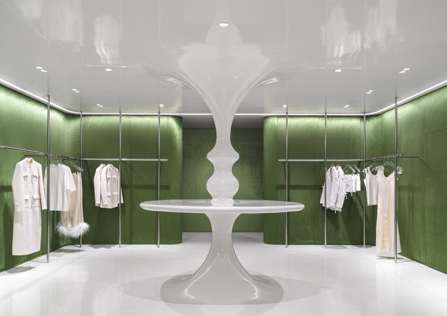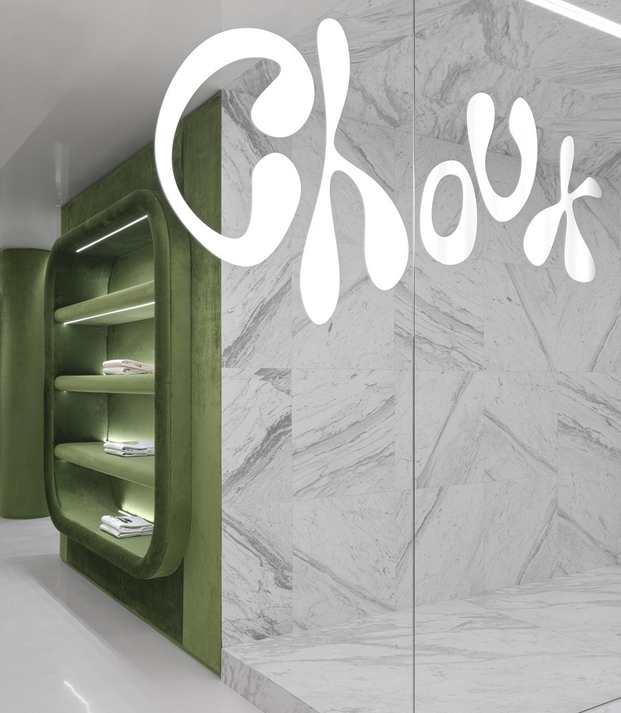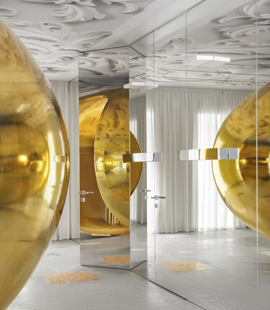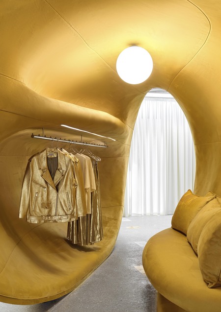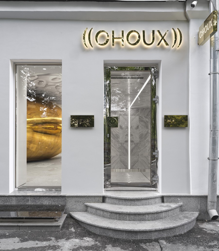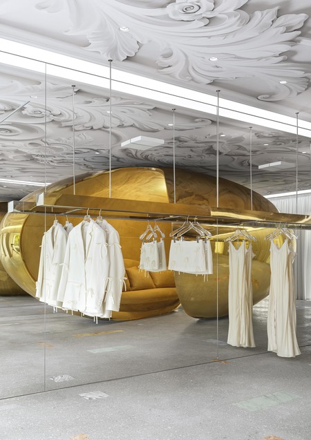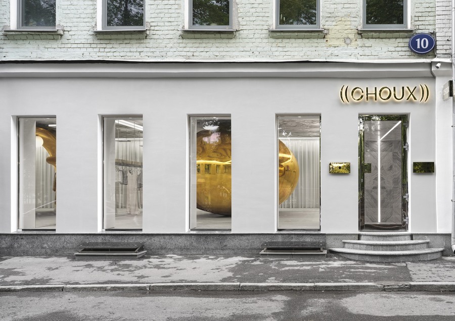 This form was created by an experiment with bionic aesthetics. Translated from French, «Choux"means «cabbage». As such, the interior contains indirect references to the brand’s botanical roots. There is baroque floral decoration on the ceiling and green textile panels on the walls. The «bean» is made of plywood and covered in gold chrome. 300 grams of pure silver were used as raw material. A rack with clothes and alarge sofa are hidden inside the «bean».