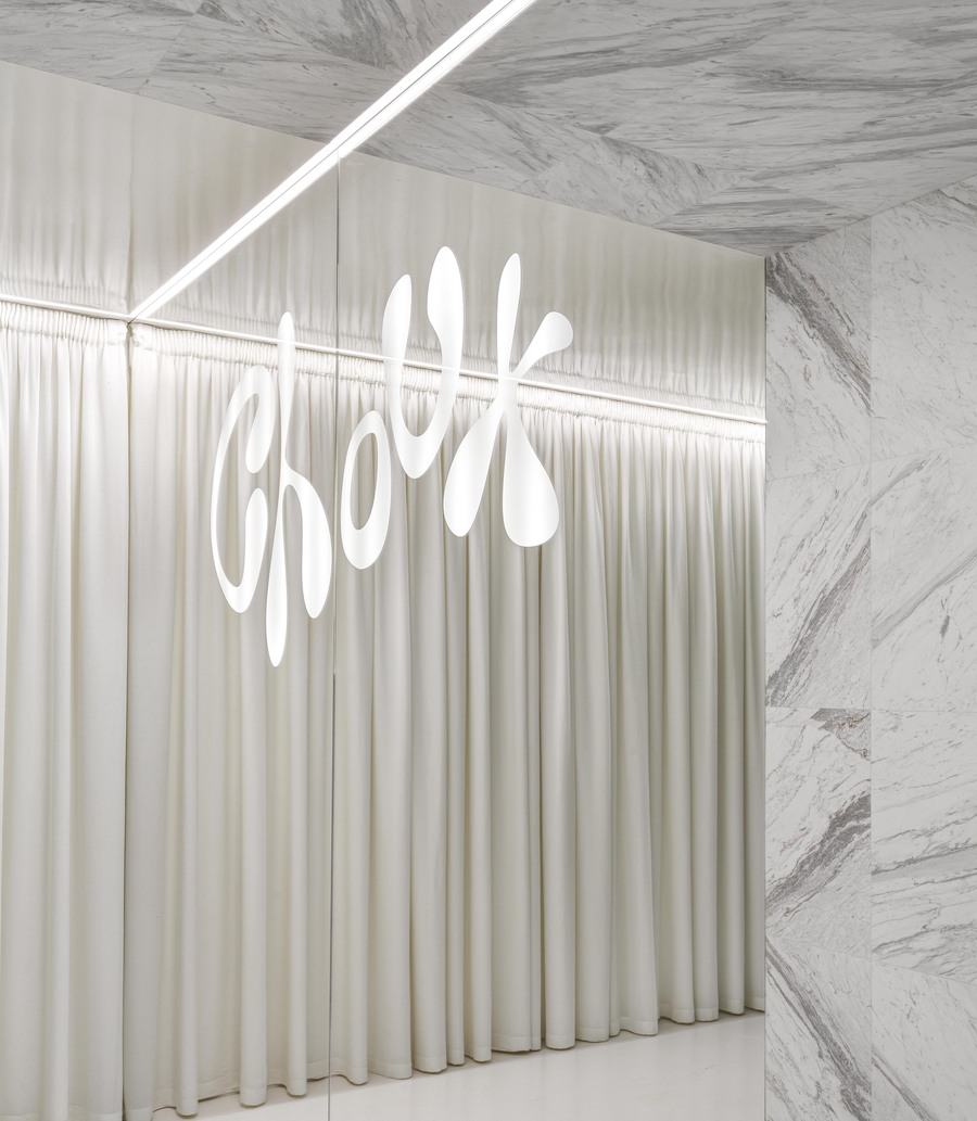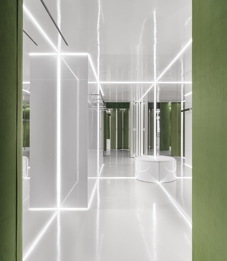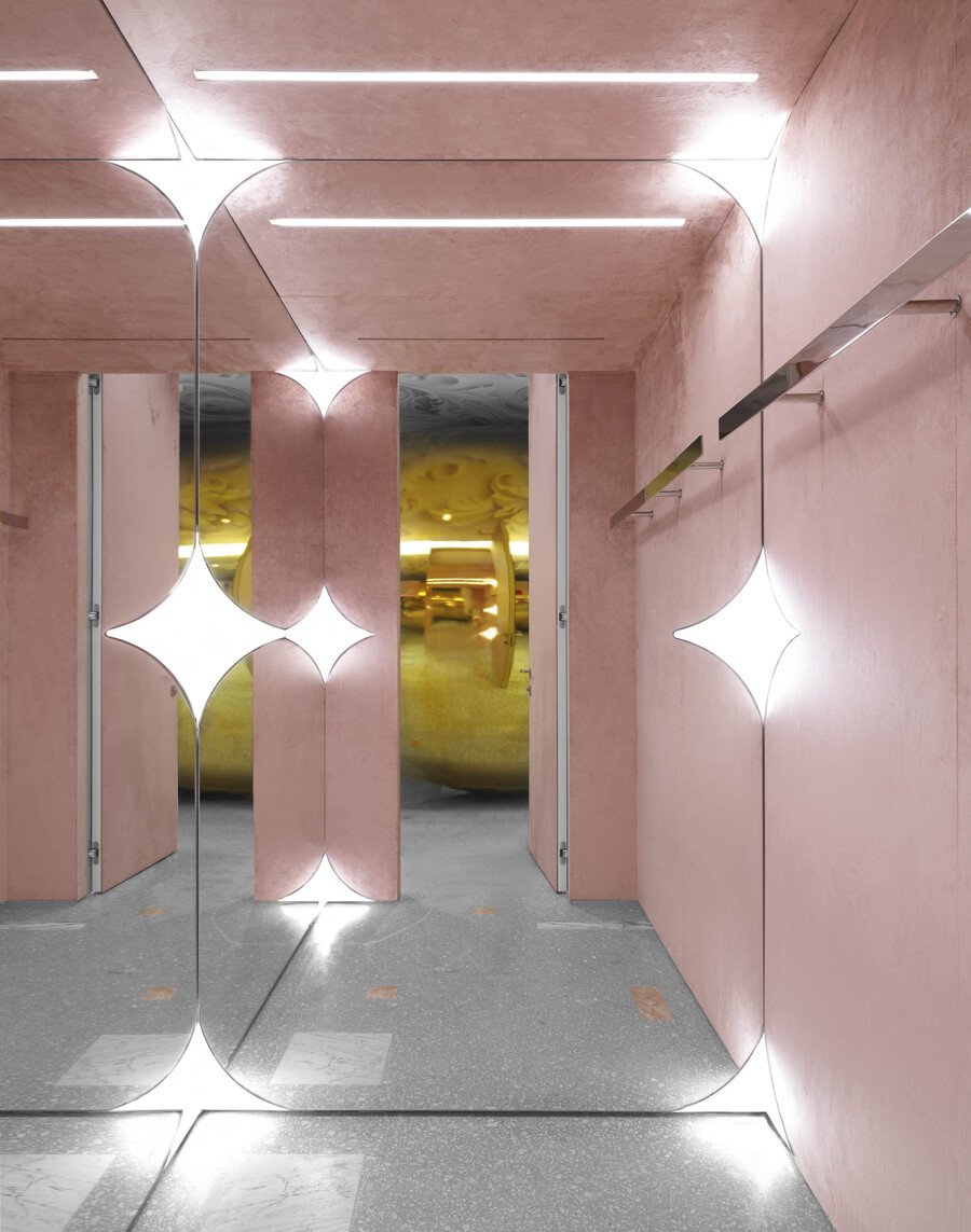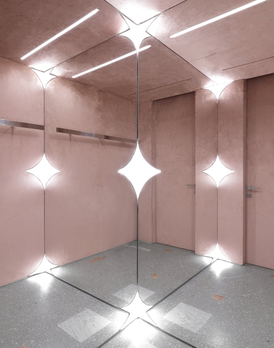 The positioning of mirrors in fitting rooms makes the space seem four times larger, and lights in the shape of four-pointed stars seem to blur the boundaries between reality and reflection.