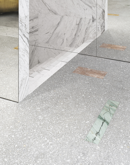On the first floor, there is a bright terrazzo floor with regularly shaped coloured marble inserts. Narrow rectangles and squares of pink, white, green and yellow marble are evenly distributed throughout the entire floor area, resembling Tetris puzzle blocks spread in different directions. A single rectangular lamp outlines the perimeter of the ceiling. In the sales hall, directional lighting sources draw attention to clothes.