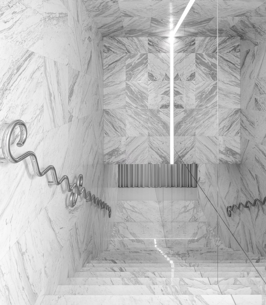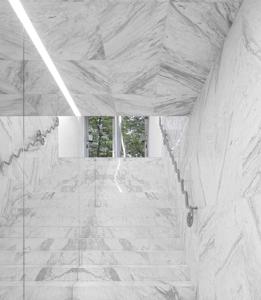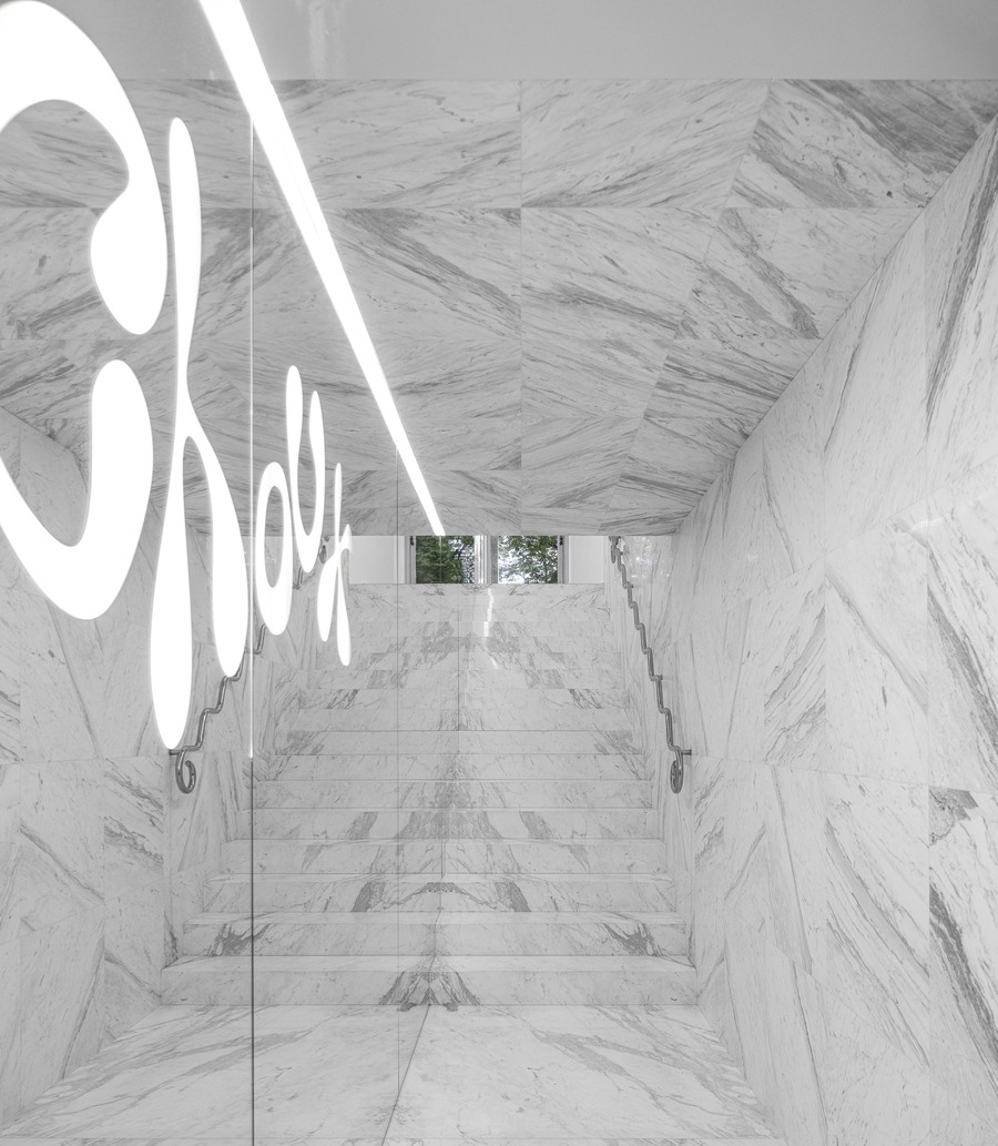 The staircase leading to the first floor is a tunnel decorated with marble tiles. A customer moves through the tunnel into a fundamentally different space.