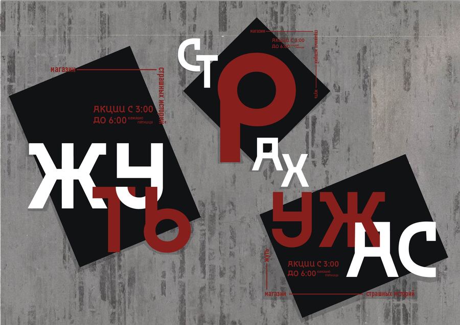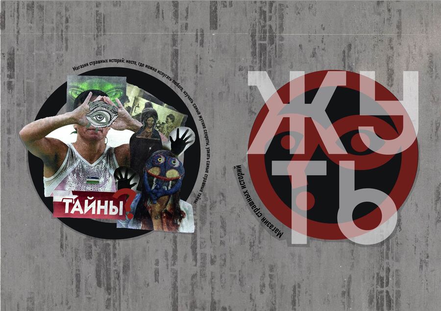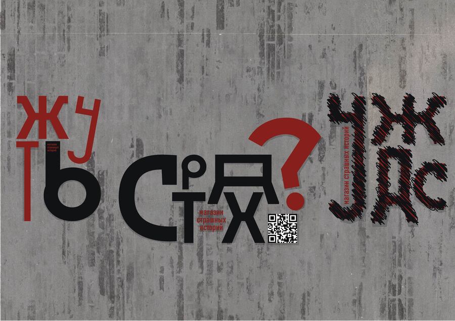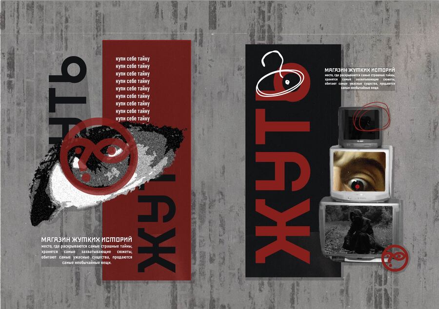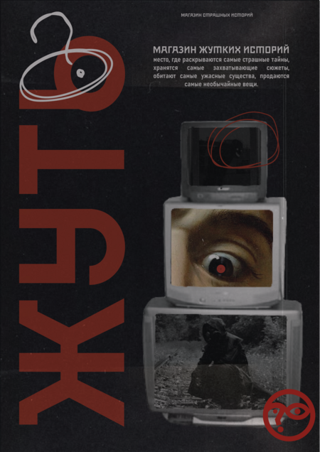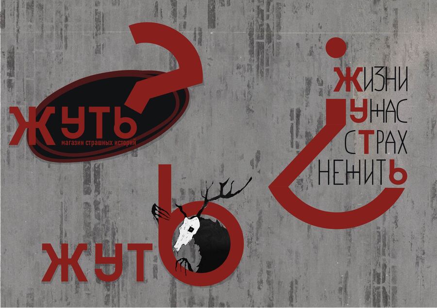 За логотип было взято лаконичное слово «ЖУТЬ» наиболее точно отражающее концепт. Также оно было дополнено дискриптом «магазин стрышных историй». Лого должно было отражать задумку и дополнять его, для этого из доски ассоциаций были взяты слова «глаз» в качестве аллюзии видеть и «вопрос» в качестве аллюзии неизвестность. Лого представляет собой напуганное лицо и в общей картине зритель читает страх, видит неизвестность, ужас.