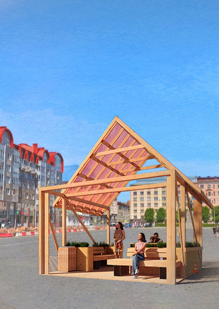 Парклет разработан для размещения на Красной площади в г. Выборг. Цветовое решение и формообразование основано на архитектурных постройках, окружающих площадь.