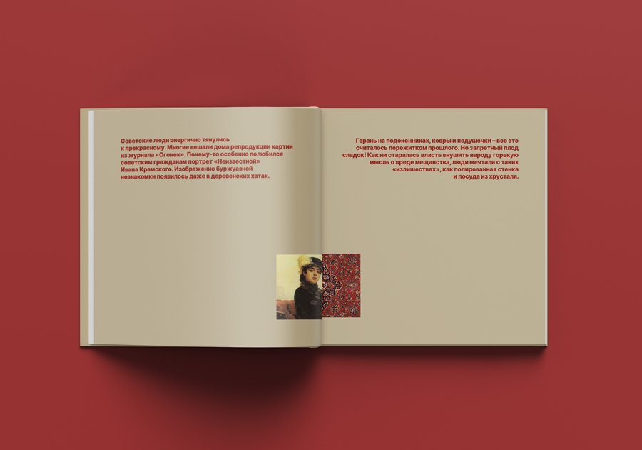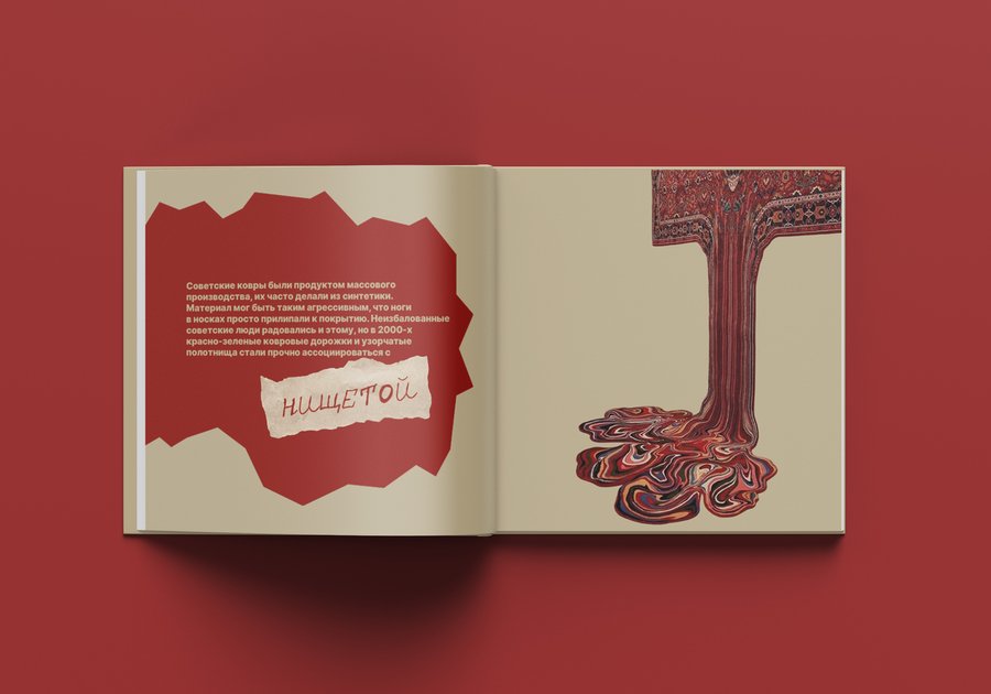 проект в стиле ретромании, попытка исследовать значимость советских ковров в жизни и быте. Использованы воспоминания и фотографии из семейного архива, а также различные атрибуты того времени. Через навивающие воспоминания материалы, рассказывается история появления и популяризации советских ковров. Представляю Вашему вниманию концепцию издания.