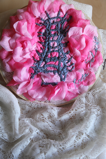 Сушилка для бутылок, 2020 Ручная вышивка. Тюль, деревянные пяльцы, пряжа, искусственные лепестки роз.
