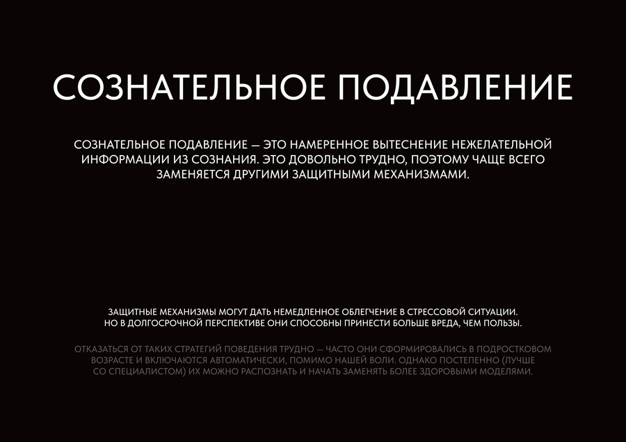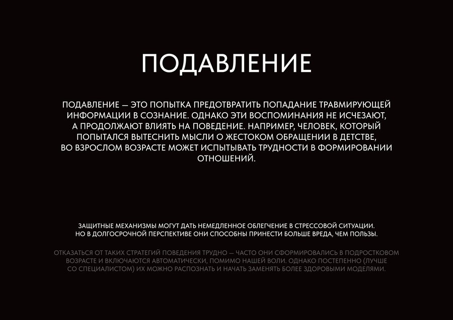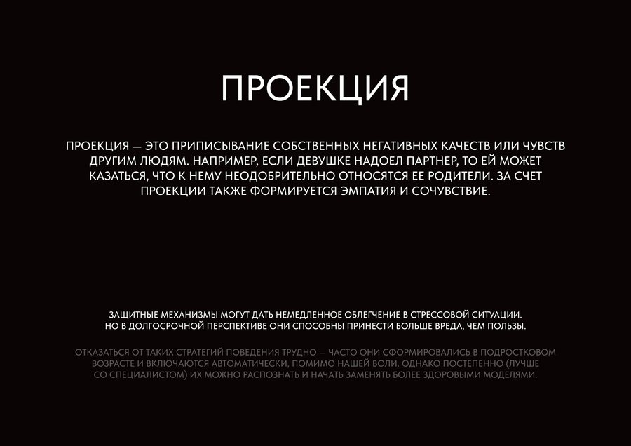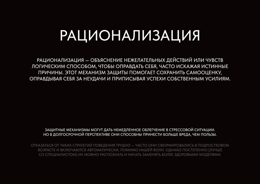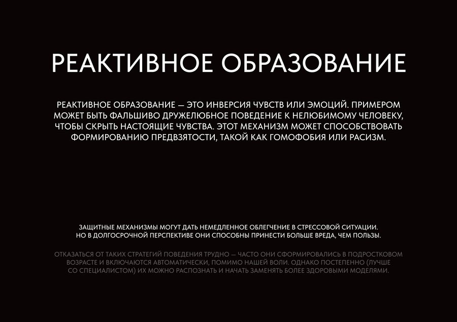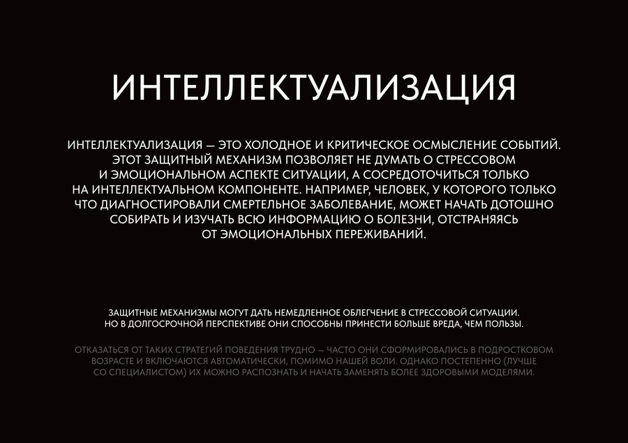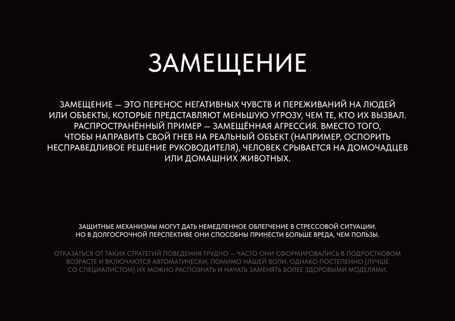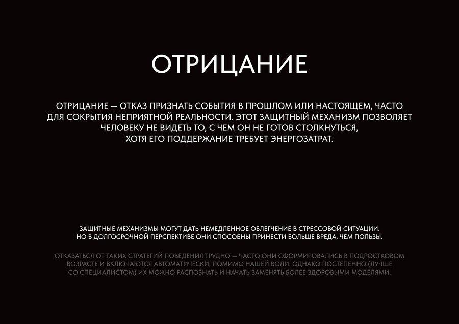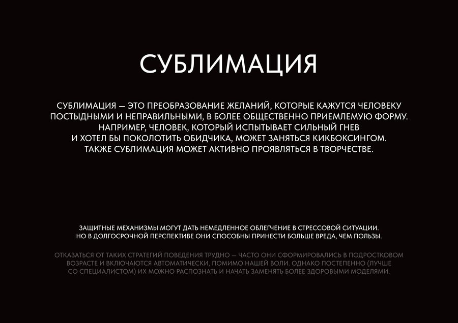 Концепция заключается в том, чтобы с помощью метафоричных иллюстраций повысить осведомлённость общества о психологических механизмах защиты нашего мозга. Каждая иллюстрация представляет собой один вид, механизма защиты нашей психики, а на её обратной стороне, находится разъяснение, которое поможет выявить его у себя. Также в каждой карточке есть совет обратиться с специалисту, что может сподвигнуть большее количество людей заниматься своим ментальным здоровьем.