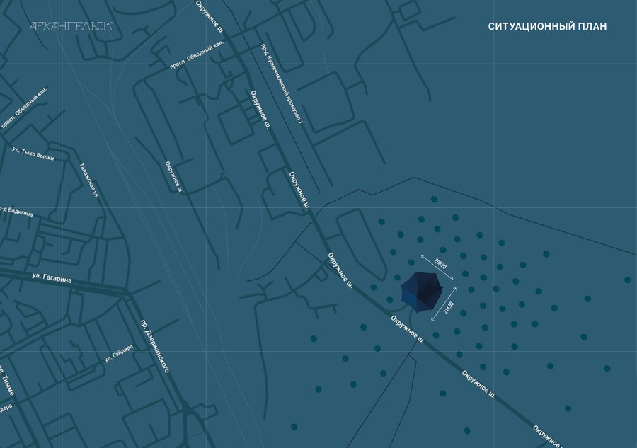 Данное торговое пространство было создано с целью объединения двух важных составляющих: осуществление торговли и создание парковой зоны. Оно расположено в Архангельске, на Окружном шоссе. Пространство находится не так далеко — в 8 км от центра города.