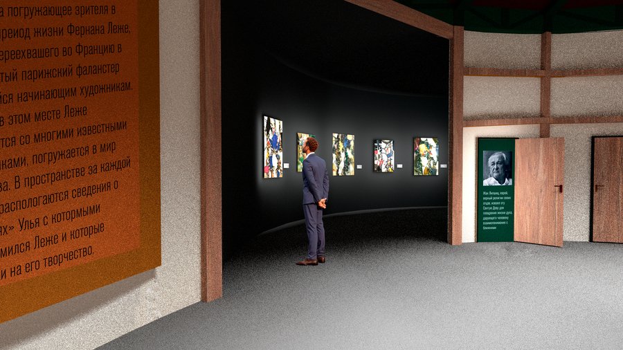 Улей (зал 1): пространство — панорама погружающее зрителя в ранний период жизни Фернана Леже, переехавшего во Францию в знаменитый парижский фаланстер сдающийся начинающим художникам. Именно в этом месте Леже знакомится со многими известными художниками, погружается в мир искусства. В пространстве за каждой дверью располагаются сведения о «жителях» Улья с которыми познакомился Леже и которые повлияли на его творчество.