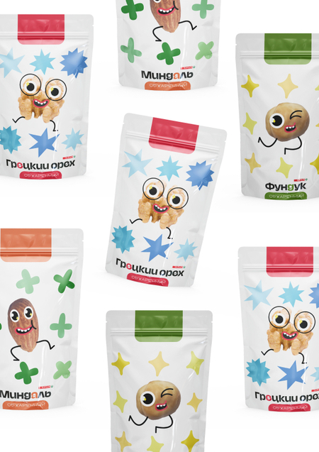 Многие дети любят покупать перекус после школьного дня. Часто они делают выбор в пользу вредных продуктов исключительно из-за яркой упаковки, которая так и кричит им: «Съешь меня! Я самый вкусный». Эта упаковка орехов должна так же привлекать внимание, чтобы ребенок самостоятельно открыл для себя мир здоровой пищи без долгих наставлений родителей. Персонажи-орехи должны ему в этом помочь.