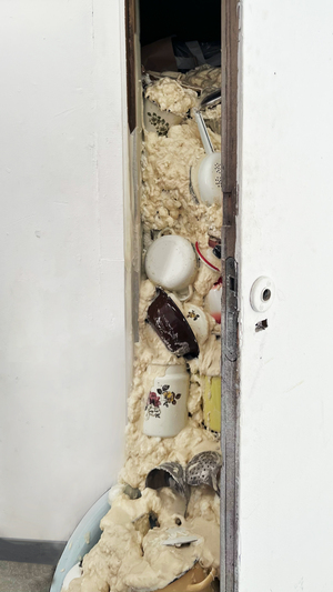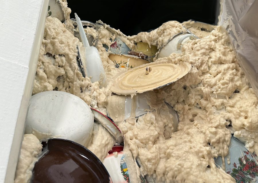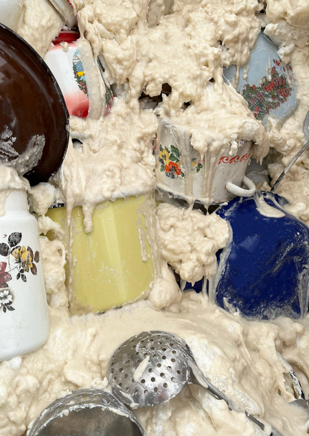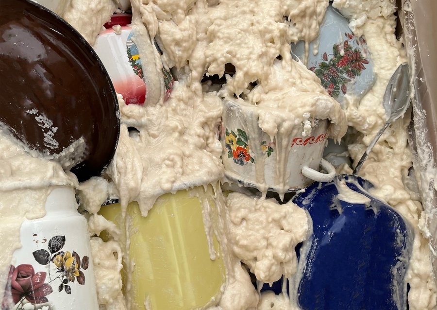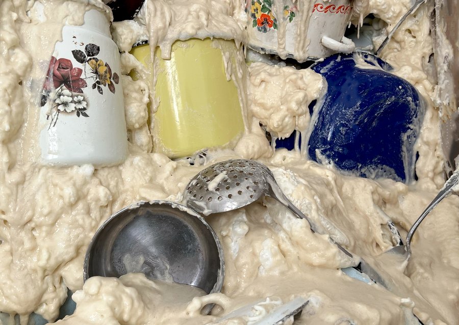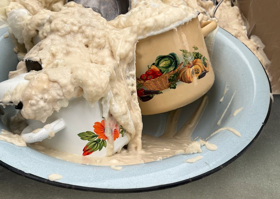 Бытовой хаос я перевожу в большие масштабы, довожу до абсурда, чтобы передать полную уязвимость человека в ситуации изменений. Гиперболизация выводит тазы и кастрюли, переполненные бесконтрольно расползающимся тестом, на экзистенциальный уровень.