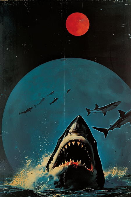 В качестве референса для последующих генераций я рассмотрела обложки фильмов с участием акул. В большинстве случаев, используется постерная обработка, клыки, морские оттенки от темно-синего до светло-голубого, красные или белые надписи. Мне не хотелось уходить в кровавую или мрачную эстетику в палитре, поскольку в моем анализе также учитываются фазы луны и взаимосвязь жителей океана с ними, что придает теме толику мистицизма.