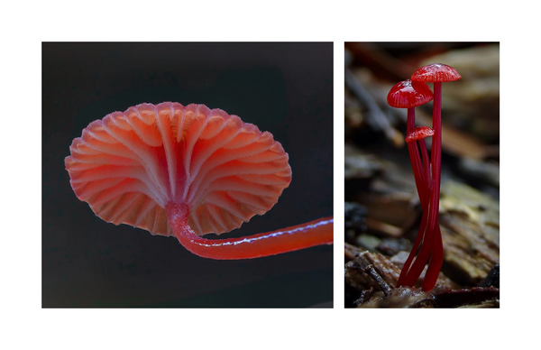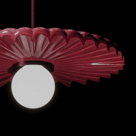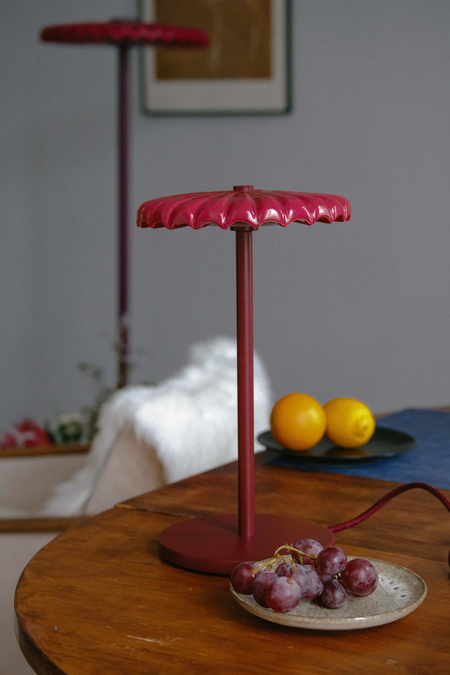 Collection of lamps inspired by Ruby Bonnet — a tall elegant mushroom topped by an exquisite cap with thin membranes.