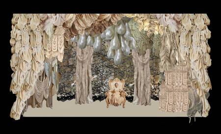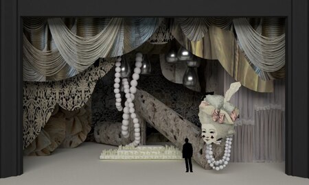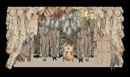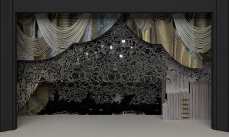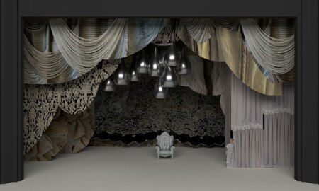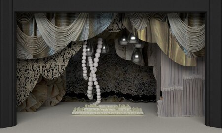 Все декорации должны складываться, мяться, вырастать из кружев и перламутра «тела» графини, вокруг которой крутятся все персонажи данной повести (да и сама графиня затерялась там).