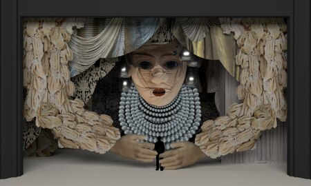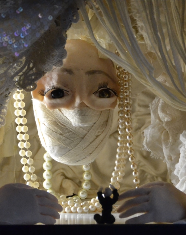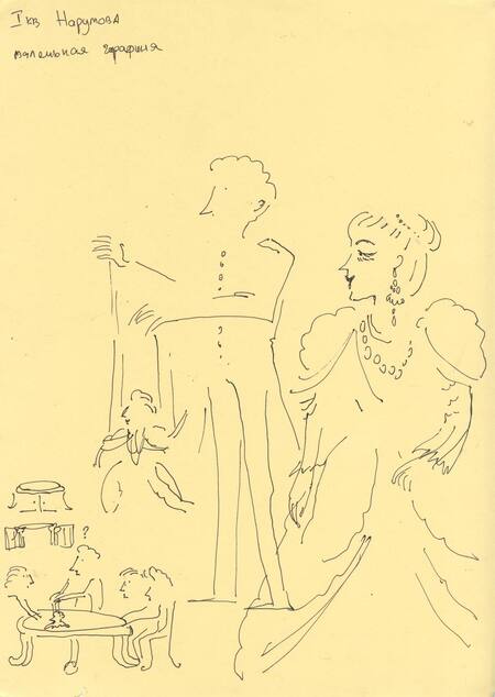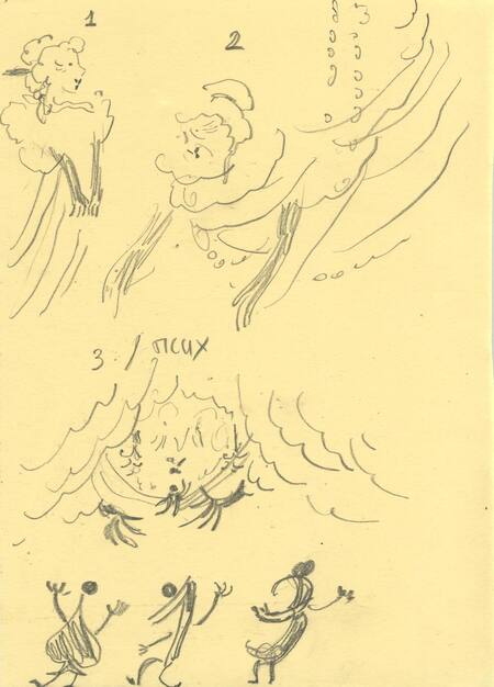 Чтобы показать влияние рока или же собственного безумства Германна надо было размножить, разрастить графиню. Так получились 3 ипостаси: — молодая графиня (меньше человека) — средняя графиня (больше человека) — большая графиня (гиперболизирована до абсолюта, занимает всю сцену)