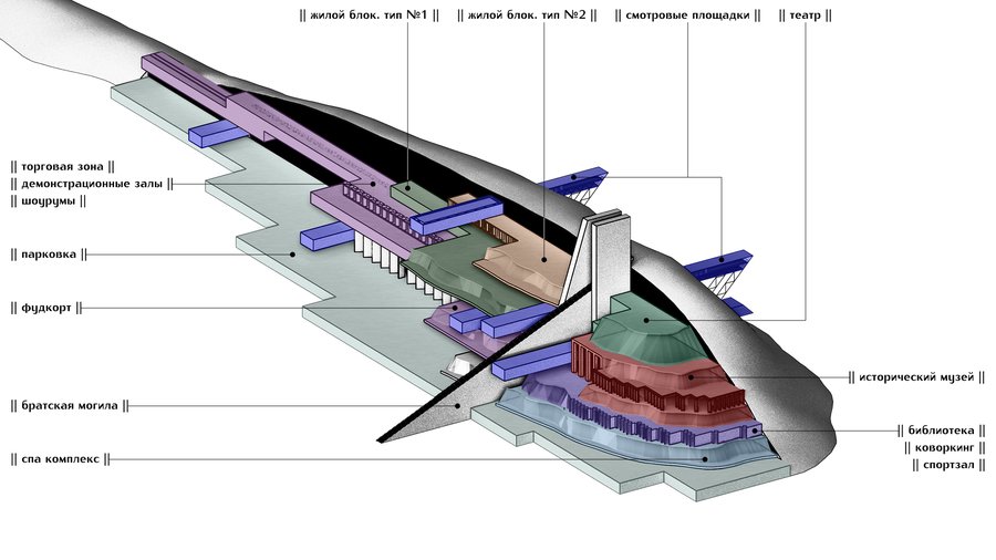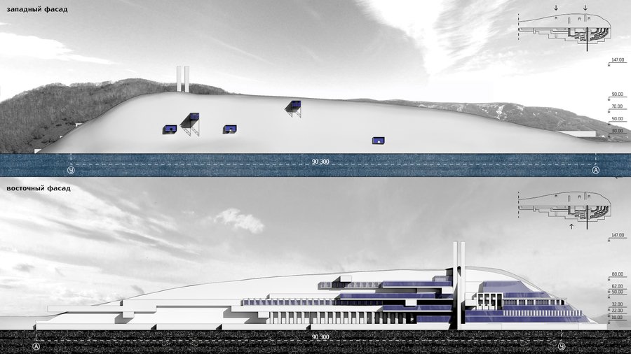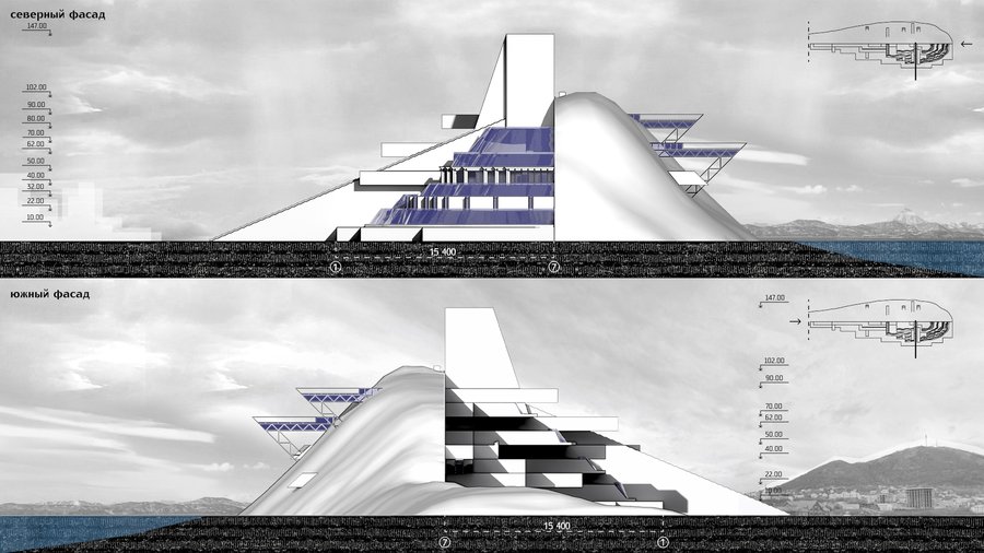 1. Сохранение «естественный» облик сопки со стороны бухты. Для кого эта декорация? Для природы, которая должна думать, что мы ничего не тронули? Это фасад — ширма, за которой происходит настоящая драма — драма города. 2. «Архитектон» встанет со стороны города. Городу мы показываем правду: мы здесь, мы меняем реальность, мы расчленяем природу, чтобы построить свой собственный миф.