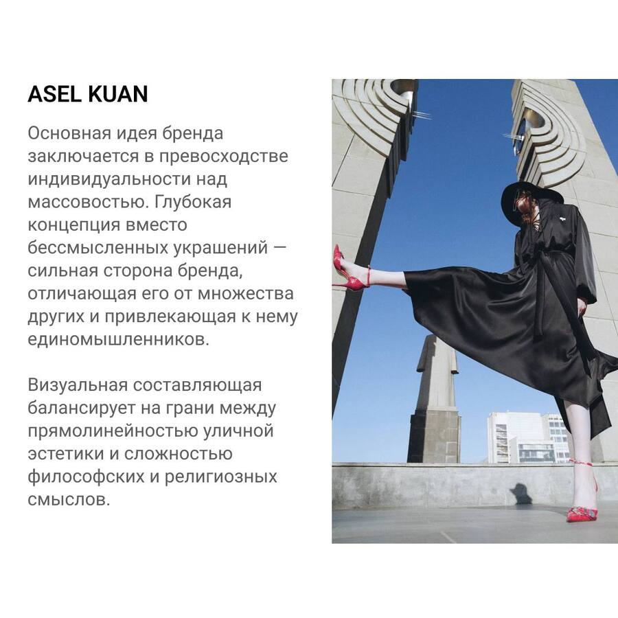 Дизайнер Асель Куан в своей работе сделала акцент на превосходстве индивидуальности над массовостью. В коллекции соблюдается баланс между уличной эстетикой и сложностью философских смыслов.