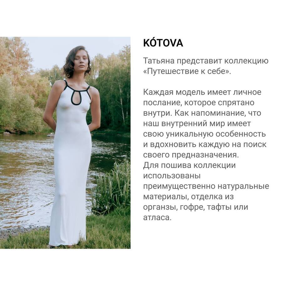 Татьяна Котова представила коллекцию «Путешествие к себе», выполненную из натуральных материалов с отделкой из органзы, тафты, гофре и атласа. В идейной основе коллекции лежит напоминание об уникальности внутреннего мира каждого человека.