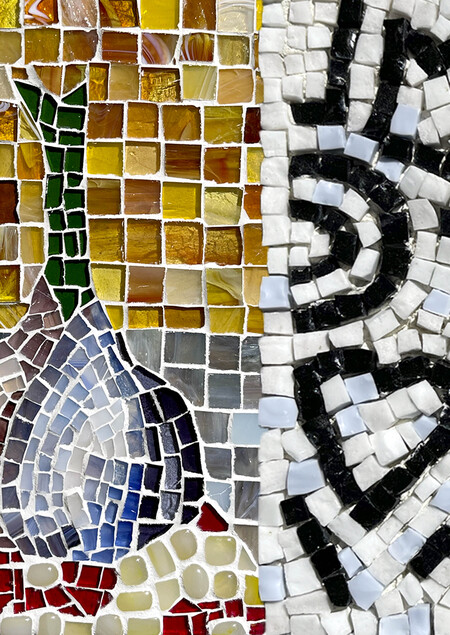 Первую картину из смальты я посвятила графичным узорам в стиле стрит-арта. Наивные формы и плавные линии собрались в чёрную композицию на белом фоне, лишь немного инкрустированном лёгко-голубыми модулями