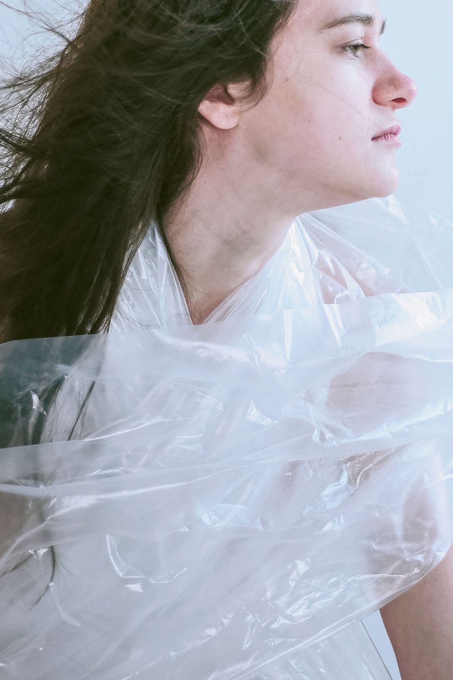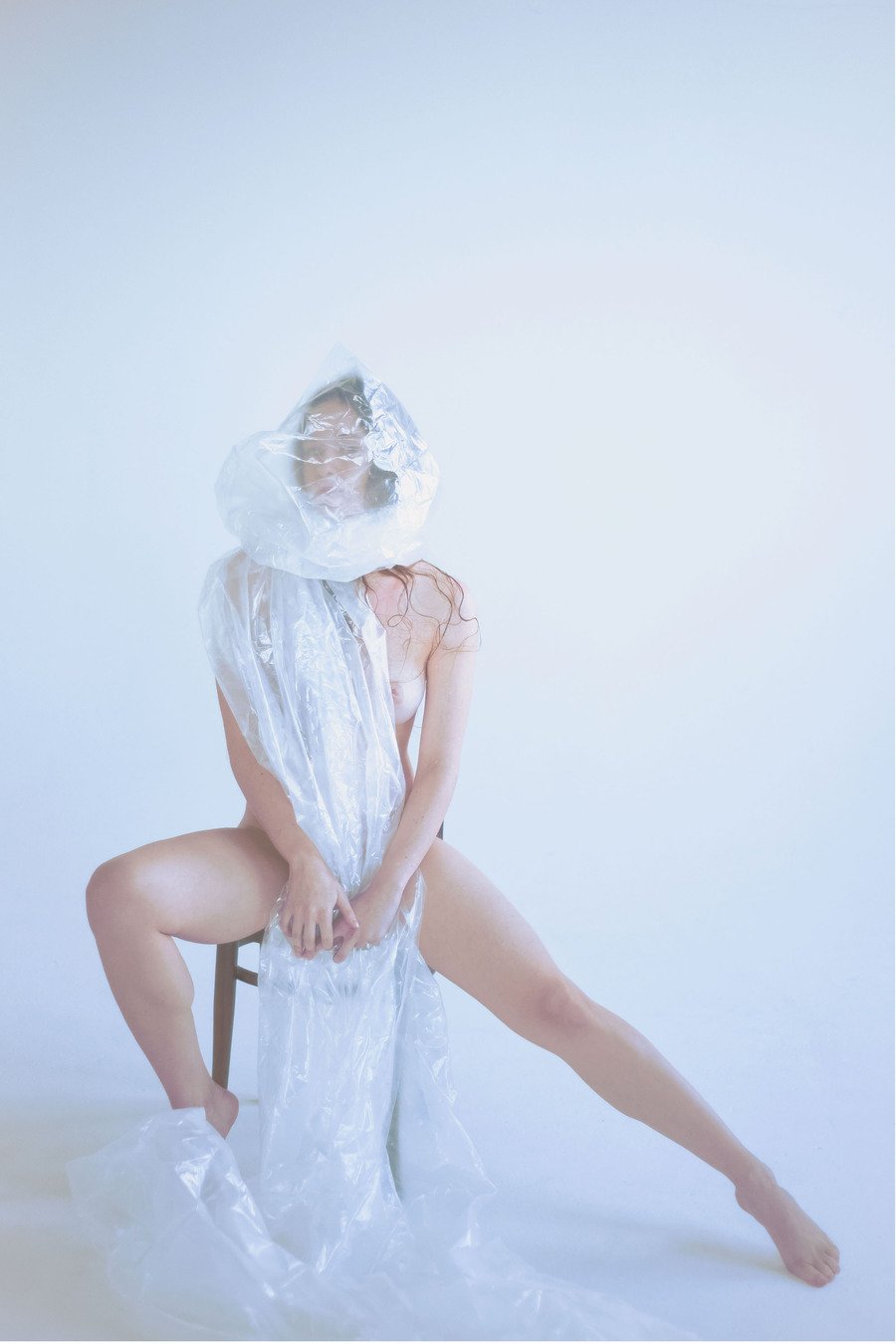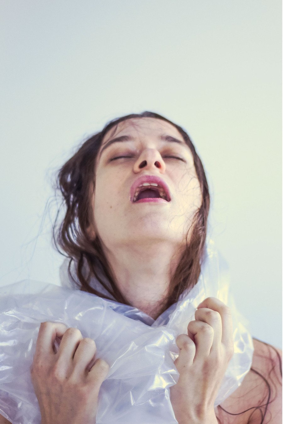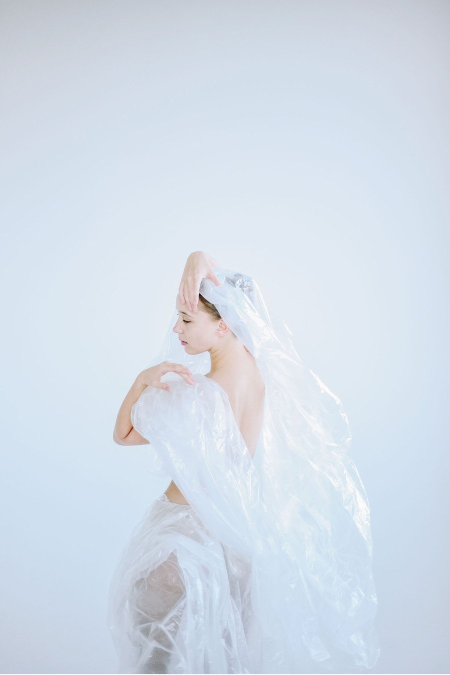 В своей работе я хотела отразить каким вижу новый пластиковый мир. И человека в нем. Мир, где живое, противостоит вечному. Где теплые человеческие тела одеты в пластиковую одежду.