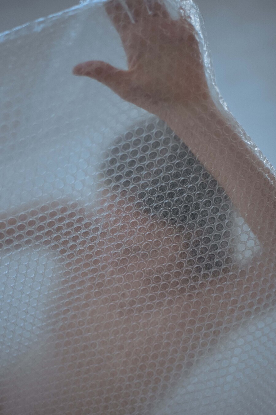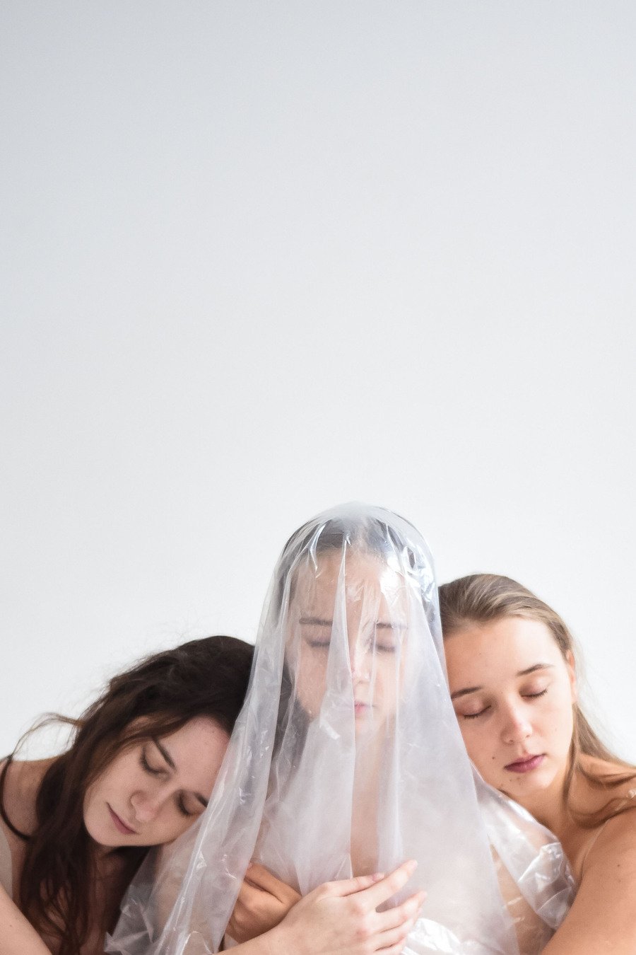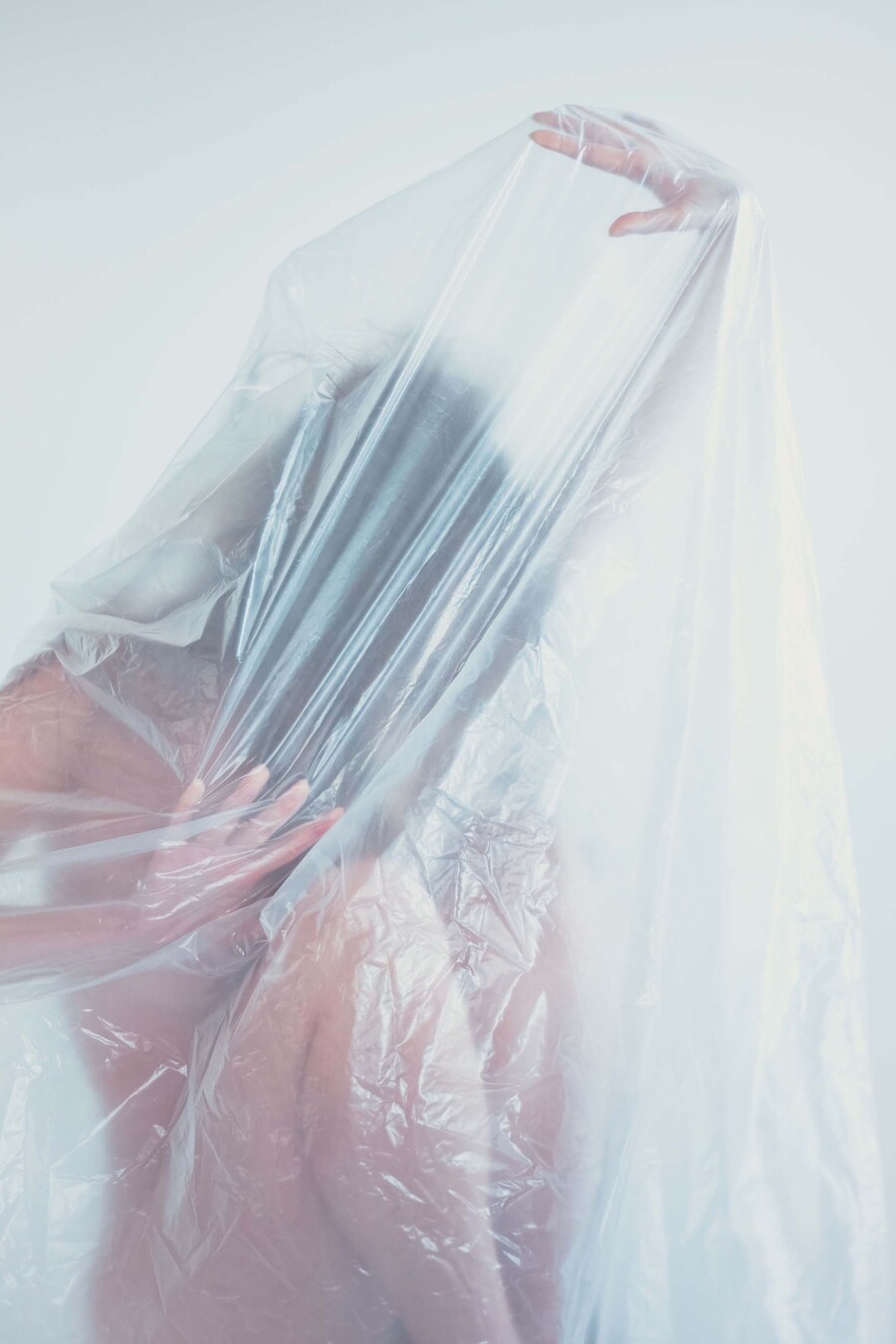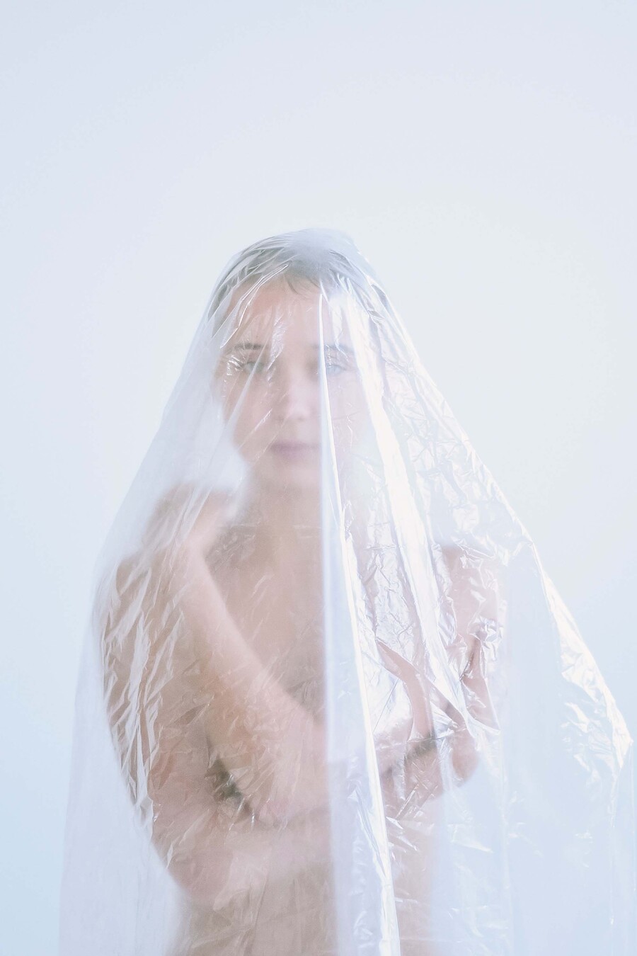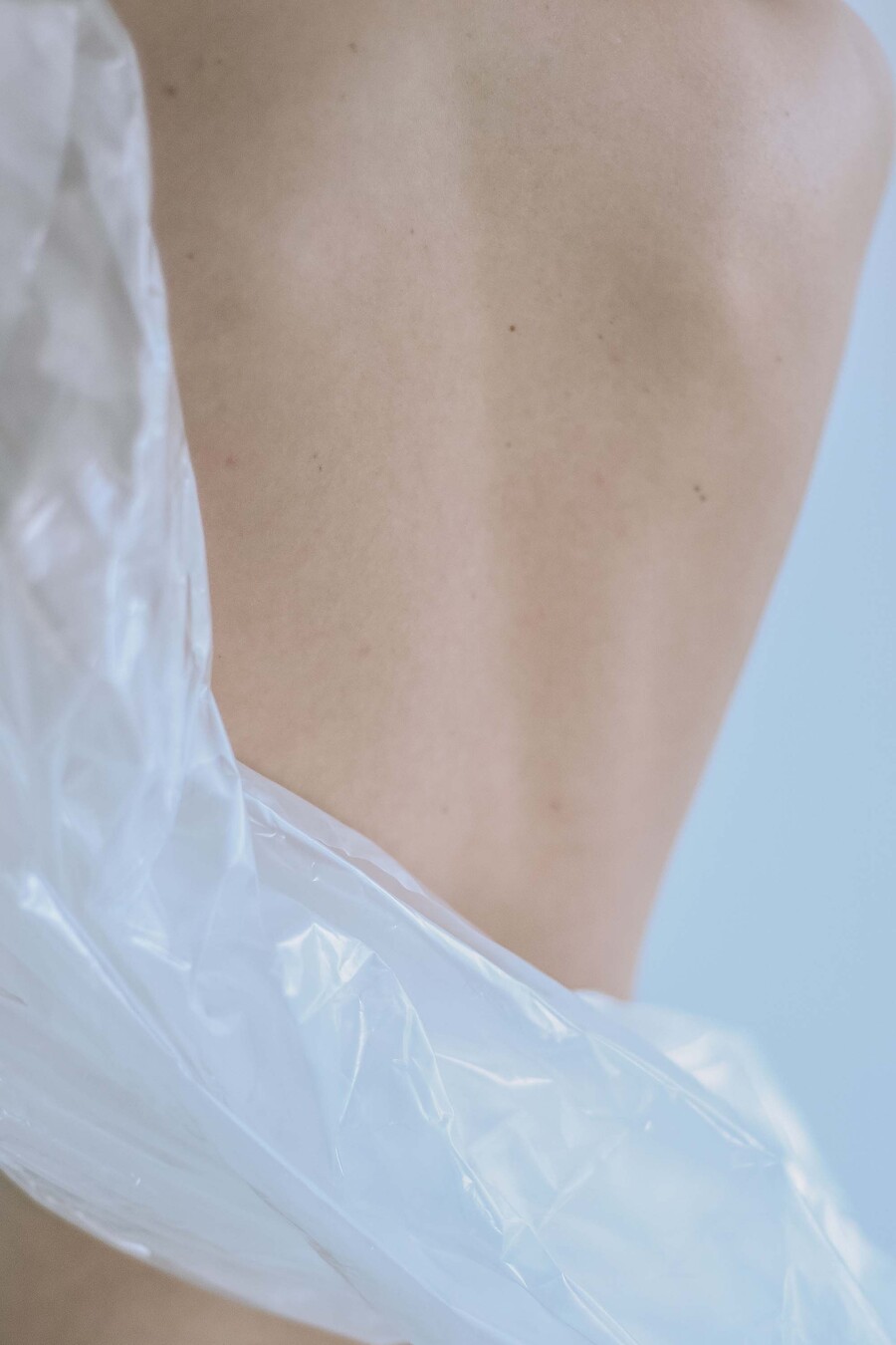 В своей работе я хотела отразить каким вижу новый пластиковый мир. И человека в нем. Мир, где живое, противостоит вечному. Где теплые человеческие тела одеты в пластиковую одежду.