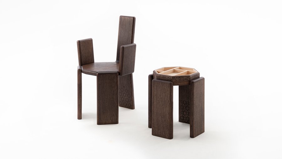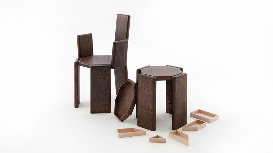 Коллекция состоит из стула, столика-табурета, съемного подноса и органайзеров.