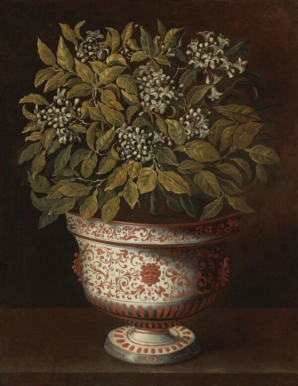 Шарлотта ван Линшотен была второй женой Герарда Корнелиса ван Рибека. Здесь она изображена в своем наряде. Ее декольте видно над глубоким вырезом платья, надетого поверх плотно облегающего корсета. Поскольку шелковые ткани были относительно узкими, ее юбка состояла из нескольких ширин. Очевидно, что узоры слева и справа от шва внизу по центру не совпадают.