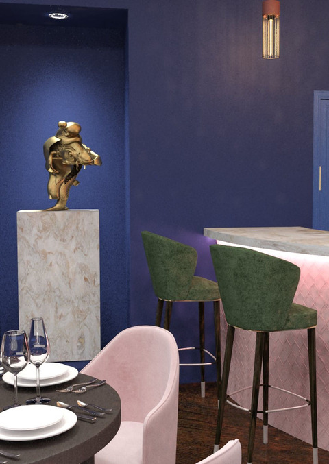 The CHAO Karp interior project embodies the idea of a fish restaurant and an attempt to rethink the usual marine theme of gastronomic establishments. Smooth lines cause the softness of perception. Glossy surfaces and pink colour make the space light and modern, but resist to childish moods due to the deep blue walls.