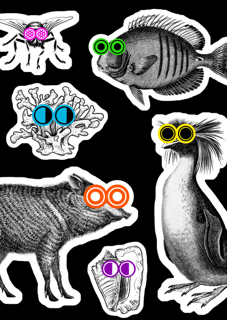 Две буквы «о» из слова «зоологический» стали не только метафорой наблюдения в музее, подобно биноклю, но и метафорой глаз людей и животных, многообразие которых в природе отлично сочетается с многообразием экспонатов музея.