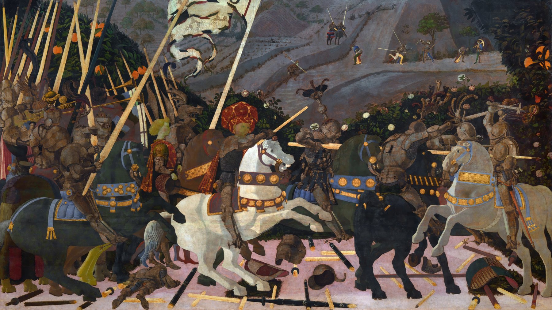 Картина была написана для украшения зала в богатом флорентийском доме и отражает вкус эпохи: битва как героическое, почти придворное зрелище. В интерпретации Уччелло война — это не кровь и боль, а возможность упорядочить мир и пространство, придать хаосу форму, и тем самым — одержать настоящую победу.