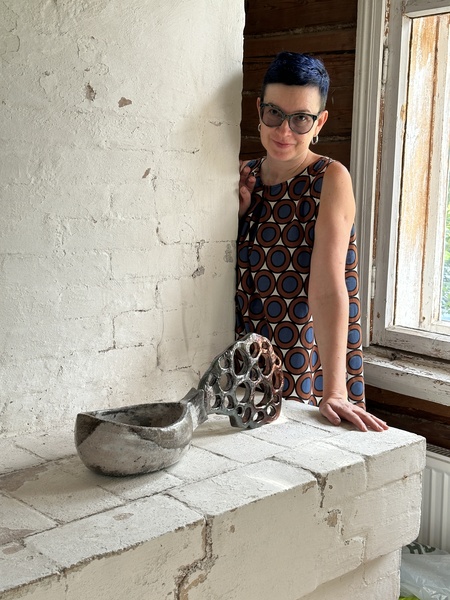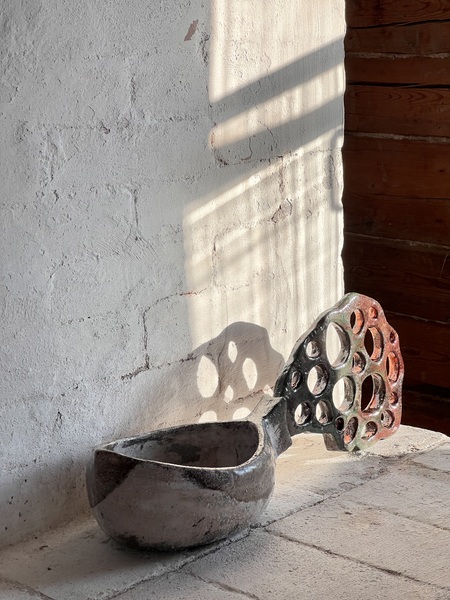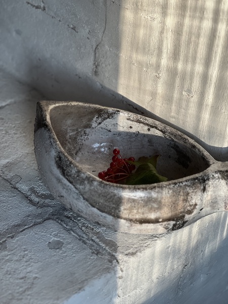 The firebird ladle is made of chamotte clay by hand building and fired in a reduction firing with smoking. This type of firing helped to implement my idea of the «Old Russian» ladle and the Firebird’s tail with fiery plumage.