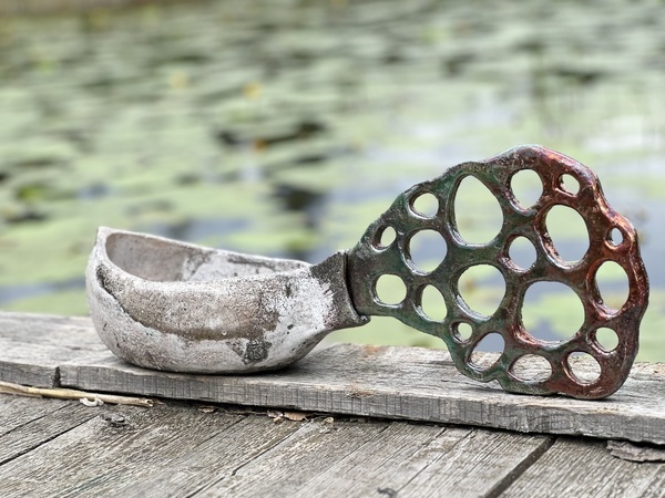 As for the decoration I used white and green copper glazes, typical for reduction firing. White glaze was applied to the ladle directly and, when smoked, it acquired interesting effects — craquelure and silver stains, which gives the surface this ‘touched by time’ look. The copper-containing glaze applied to the handle-tail of the ladle was restored during the firing process and has a color from green to golden-red.