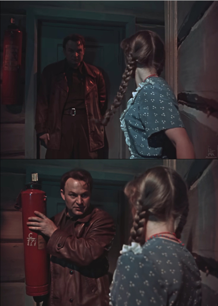 В фильме «Дети партизана» 1954-го года несколько раз показывается сначала реакция девочки, а потом приближающийся к ней шпион — такой монтаж усиливает переживания за детей и позволяет создать более напряжённые кадры с приближением.