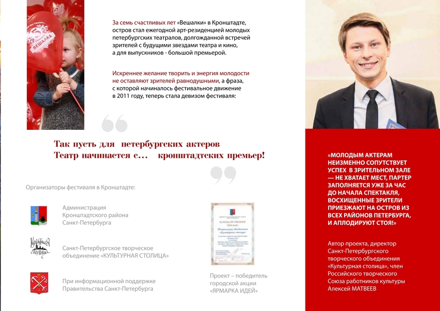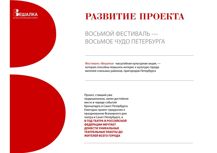 Команда проекта не первый год проводит фестиваль «Вешалка». В Год театра проект был представлен на форуме «Таврида», получил поддержку оргкомитета Года театра и Росмолодежи. Фестиваль получал региональные гранты и финансовую помощь Президентского фонда культурных инициатив. В 2020 году в период пандемии в результате интеграции фестиваля в онлайн-формат, прямые эфиры спектаклей и встреч набрали более 1000000 просмотров.