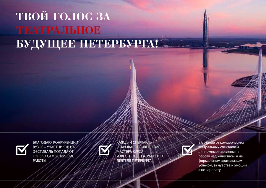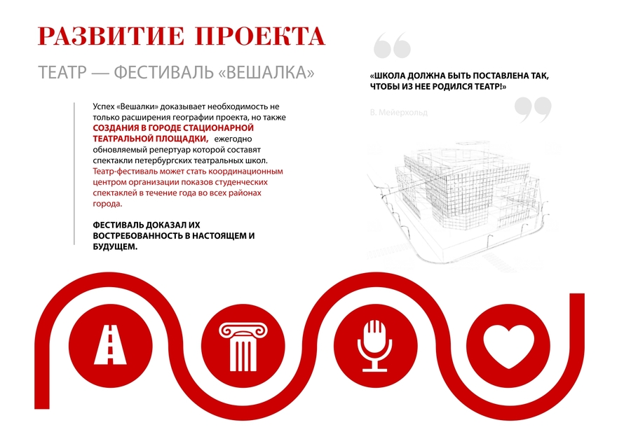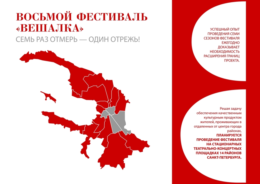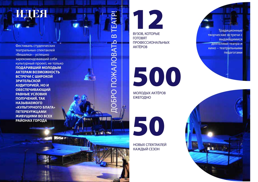Проект направлен на взаимное решение обеих социально-значимых проблем: интеграцию образовательного процесса в масштабную культурную акцию региона, которая продемонстрировала очень высокий уровень дипломных спектаклей как культурного продукта и положительный эффект применяемой маркетинговой схемы привлечения зрительской аудитории на приспособленных площадках отдаленных районов культурной столицы.